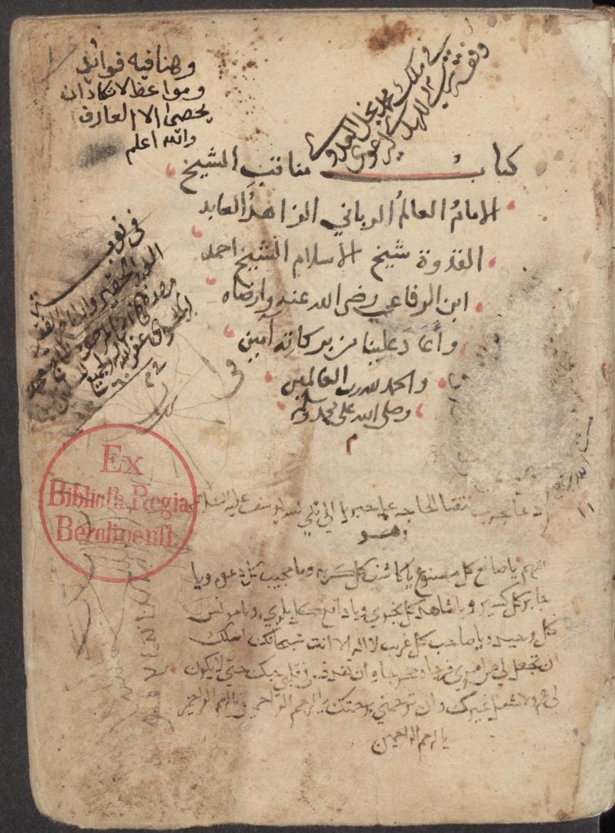 For the new Arabic reading group, this semester we will be working through a selection of manāqib texts—hagiography, though that translation does not precisely capture the full complex valence of manāqib as a term. Starting with a manāqib of Nafīsa bint al-Ḥasan, we will explore each text’s particularities, narratives, and strategies in depicting holy people, while also thinking about the nature of the manuscript setting, and examining textual transformations where possible. After the manāqib of Nafīsa we will be examining a very curious manāqib that is about—and not about, though I don’t want to give away more!—ʿAdī ibn Musāfir. I imagine we’ll have time for a third text, to be determined however.